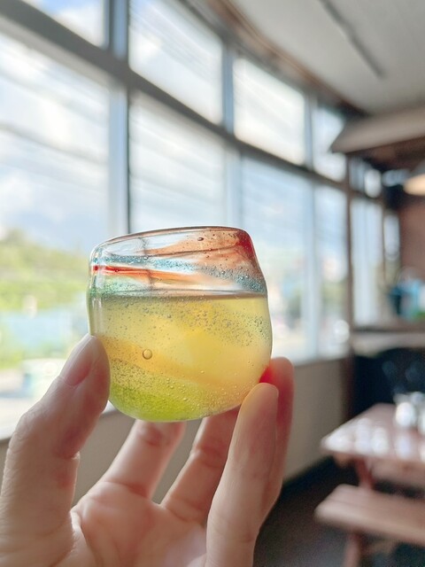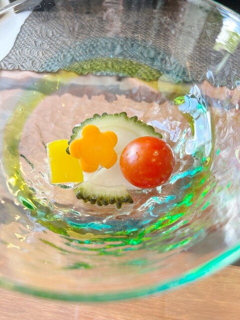 食前酒の琉球ガラスに入ったシークワサーは琉球ガラスでとっても美しいです。