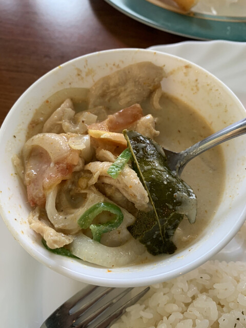 私がジャークチキン、友達はグリーンカレー。どちらもなかなかスパイシーでおい...