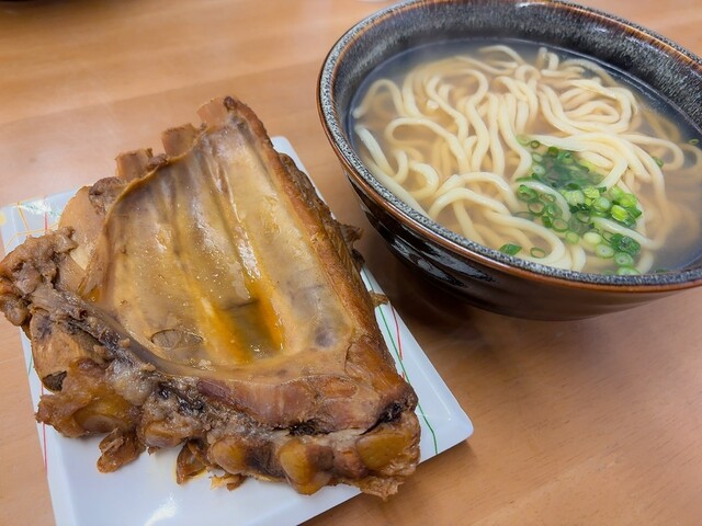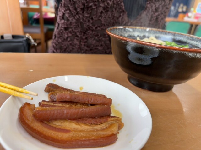 三枚肉は、お肉が柔らかくてホロホロ、出汁がよくしみこんでいてやや甘めで濃厚な味。出汁は透き通ったカツオと豚骨の出汁が効いたスッキリめの...
