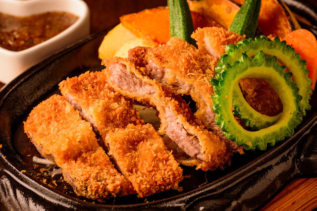 『贅沢三昧 』石垣牛200g・アグー豚180gのハンバーグとやんばる地鶏のソテーが一つになったまさに贅沢な一品。 沖縄を堪能するなら間違いなし☆