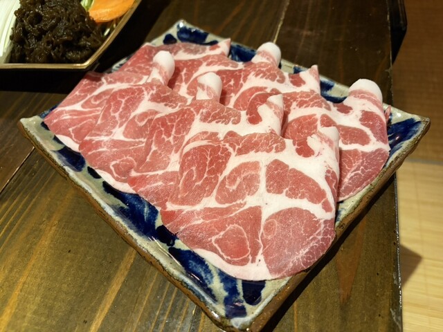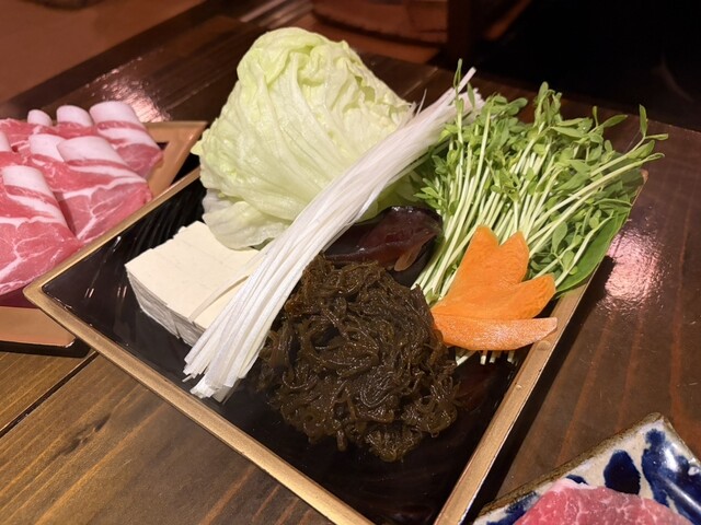 『もずくしゃぶしゃぶ燦あぐー』(6,340円)のコースを肩ロース、〆はおそばでお願いしました。