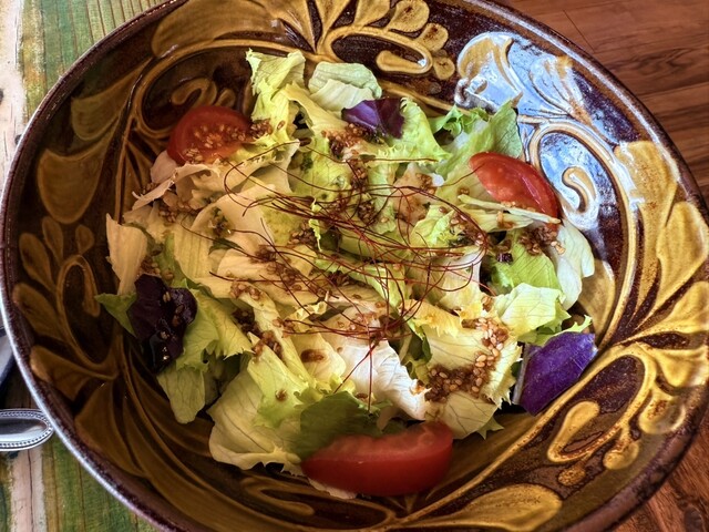 新鮮な葉物野菜がたっぷり、ピリ辛のごま風味ドレッシングが食欲をそそります。ピザとの相性もばっちりで、口直しにもなる一品。