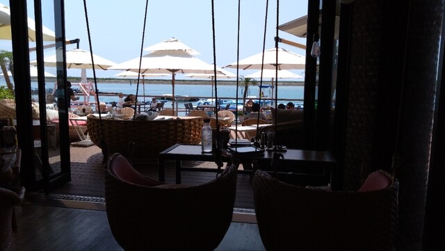 青い空と海がまぶしい絶景オーシャンビューのお店で、客席はゆったりとしたソファ席、カップルにはハート型チェア、さらにハンキングチェアもあって、まるで海外のリゾート地にいるかのようなロケーションです。