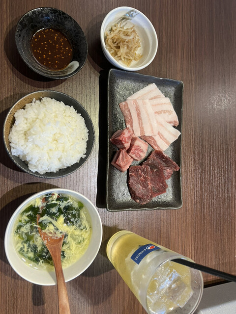 北谷のアメリカンビレッジに来ると 肉食いたくなるよな 焼肉屋さんのランチ行こ ○Aセット 2000 ・中落カルビ ・豚バラ ・ハラミ ・ライス ・スープ ... 詳細を見る