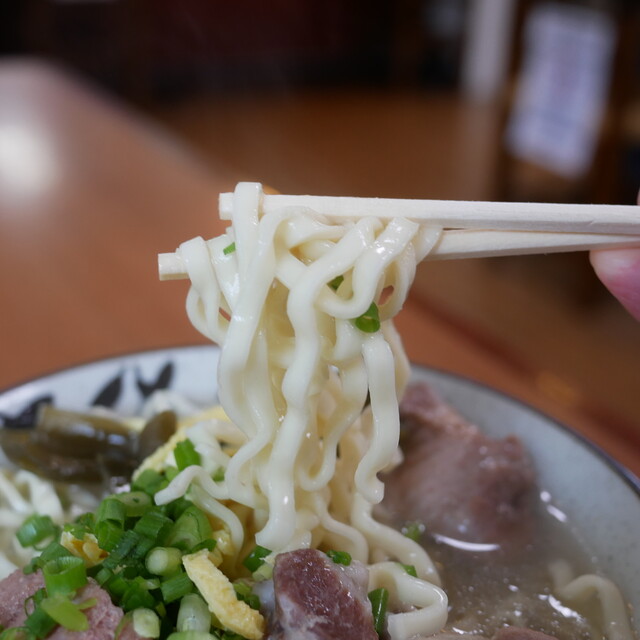 ちぢれ麺のかためになっていますが、歯切れのよい食感で沖縄そばならではの麺となってます。