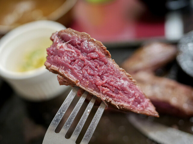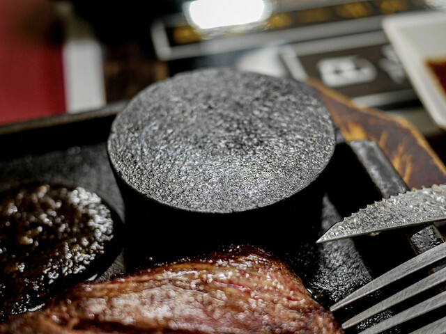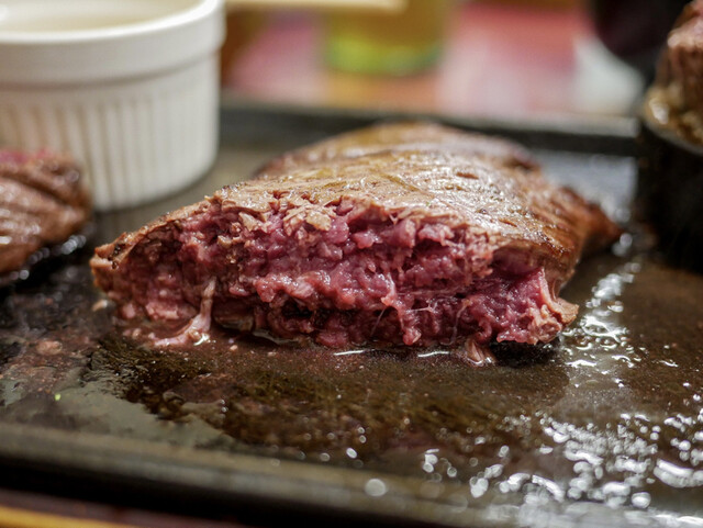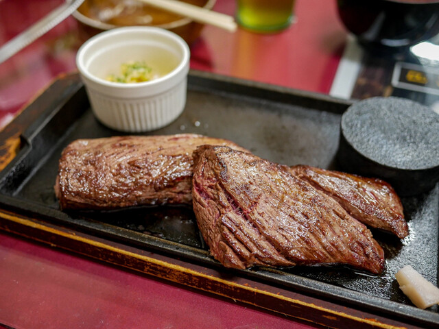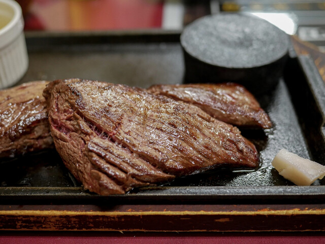 初めてで量のイメージがつかなかったものの、卓上に並ぶオリジナルステーキソース、わさび醤...
