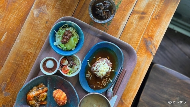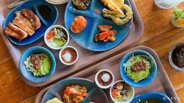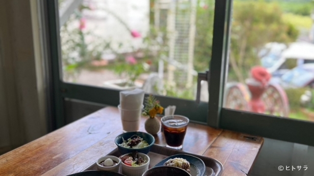 南城市にある【カル・カフェ】は、青空と緑の芝生に映える白壁が目印。店内にはオーナーが趣味で集めたというヴィンテージ家具や雑貨のコレクションがずらり。まるで『赤毛のアン』の世界のような非日常空間を演出してくれています。『ハンバーグランチ』や『ステーキランチ』は、奥武島直送マグロの刺身や地場野菜をふんだんに使った日替わり副菜付き。食後には手づくりのパフェとフリードリンクでくつろぎタイムを過ごせます。