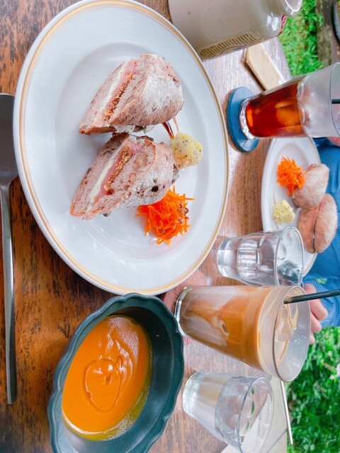 植物たちに囲まれたテラス席で頂くサンドイッチとスープのセット♪