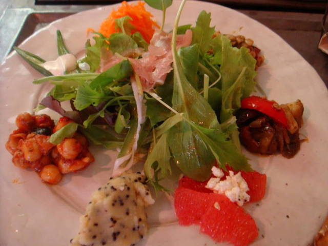 丸いお皿には、生ハムサラダ、押麦のマリネ、人参マリネ、魚介のディップ、ひよこ豆のトマト煮、パプリカと茄子のマリネ、カッテージチーズとブラッドオレンジです。