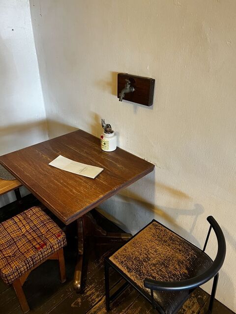 壁に蛇口のオブジェがあり、前もここに座ったかも。