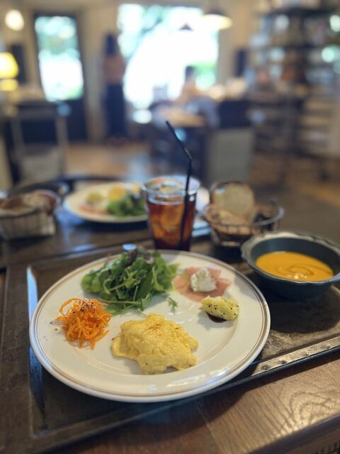 AMプレートは、スクランブルエッグとパン、スープ、サラダのプレート、ドリンク付きです。