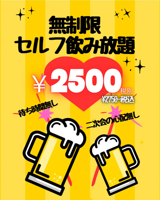 | コース | 飲み放題、3時間以上飲み放題 |