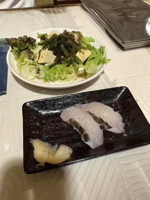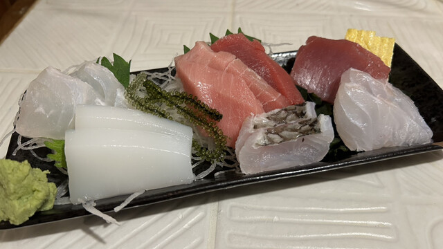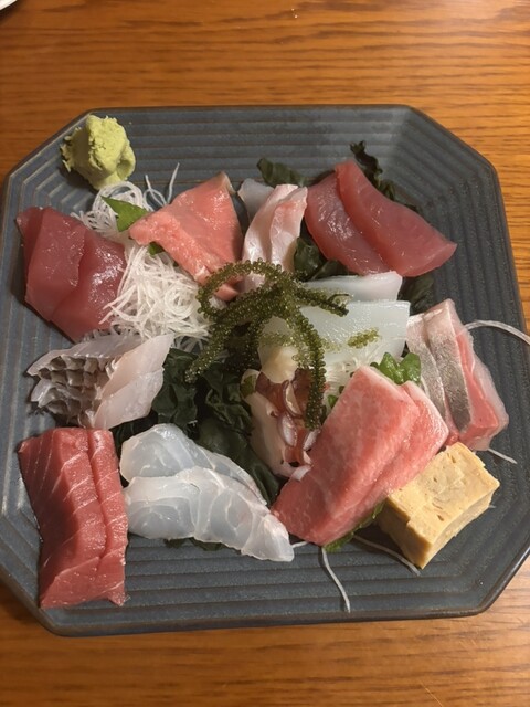 お刺身の盛り合わせと熱燗でゆっくりおさしみを楽しみました。盛り合わせはマグロが多め。セイイカがありました(*´ω`*)その他のお刺身の説明がなかったので何の魚かは分からなかったのですが、鯛...