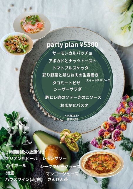 | サービス | 2時間半以上の宴会可、お祝い・サプライズ可(バースデープレート)、テイクアウト |
