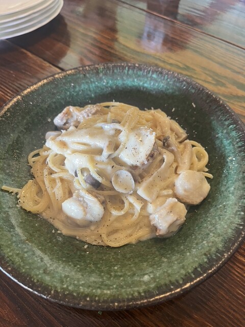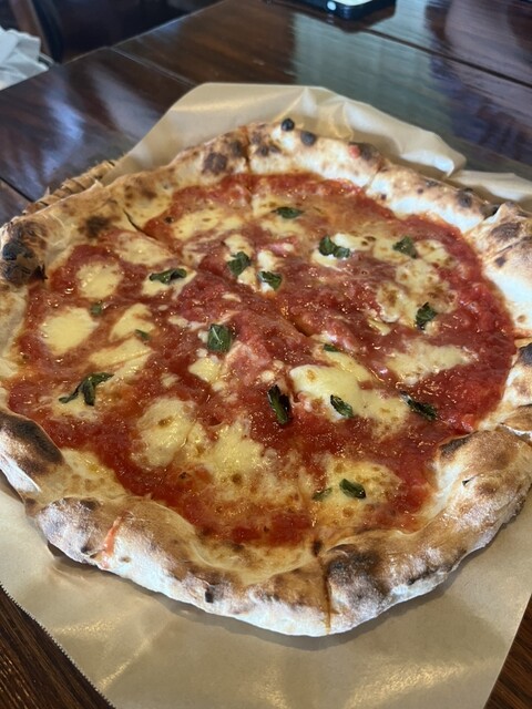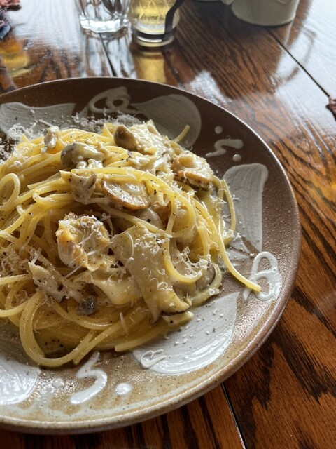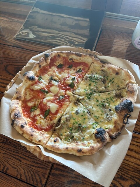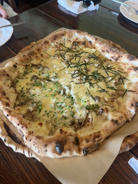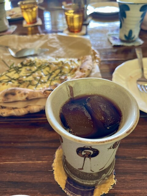 今年は開店時間に予約して1組目の客として訪問しました。晴れ間がのぞいたので、店前からの眺望を楽しみながらピザを待ち(去年より待ち時間が少なかったです)、去年と同じマルゲリータと、ゴボウ+テリヤキチキンのhalf&halfにパスタ一皿。スッキリさっぱりとした食べやすいトマトソースと濃厚チーズで今年も大変美味しくて満足しました。氷がコーヒーで出来てるアイスコーヒーも堪能し、満足満足でした。