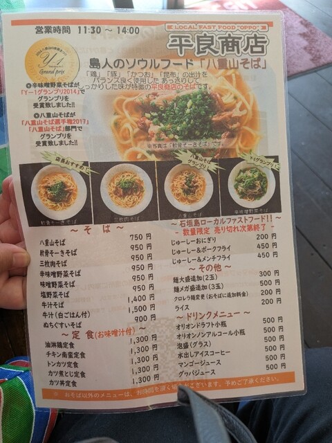 石垣島で遅いランチ。食べログでチェックして平良商店に行くことを決定。しかし、自動車での移動だとぎりぎり間に合うか間に合わないか。電話をして14時には行きますのでと御願いして、14時直前に滑り込む。注文...