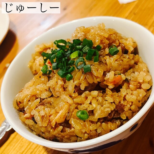 沖縄風の炊き込みご飯だそうです醤油や味噌で味付けされたご飯に肉、魚、キノコ類、野菜が入っている。