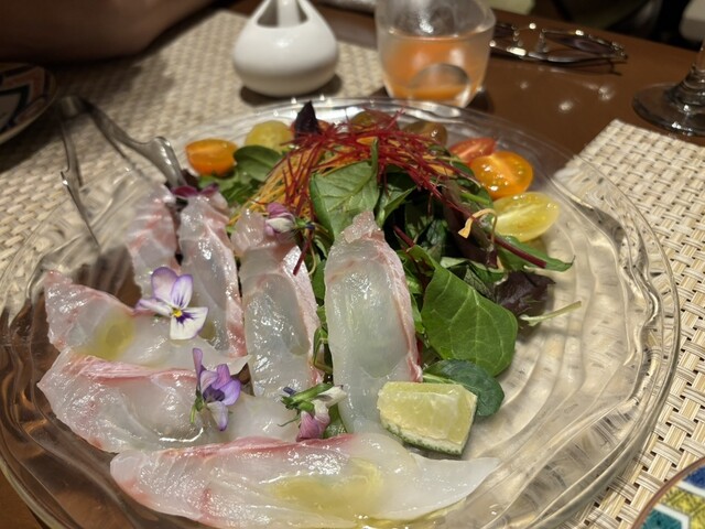 ミーバイのカルパッチョ、鮮魚(この日はアカマチ)のマース煮、アカマチ蒸焼き、そしてノコギリアザミのシンガポールチリソース煮などをいただきました。