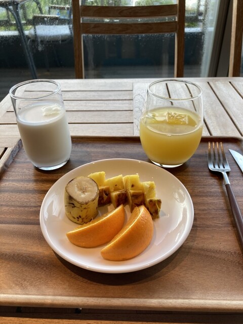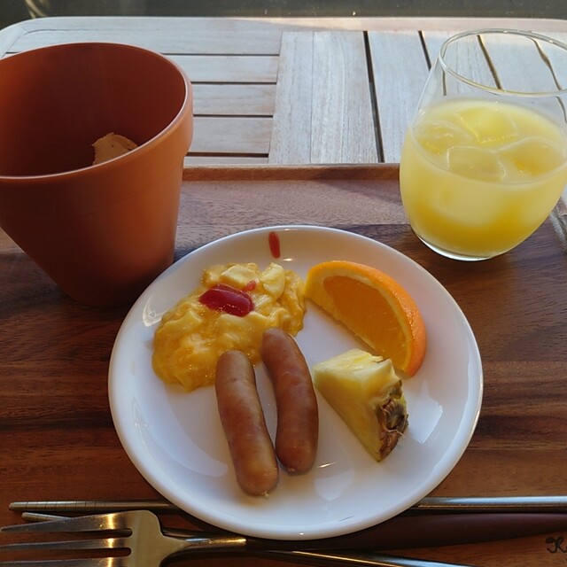 ビュッフェコーナーにはサラダやフルーツ、玉子料理やウインナー他、カレーやシリアルもあります。ドリンク類も豊富で、クッキーやラスク等お菓子もあり楽しいです。