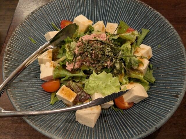 前菜(島らっきょう、ミミガー、島豆腐)、ジーマーミ豆腐、刺身盛り3種(海ぶどう付き)、シーザーサラダ、ラフテー、天...