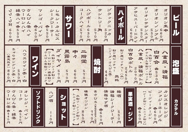 | ドリンク | 焼酎あり、ワインあり、カクテルあり、焼酎にこだわる、ワインにこだわる、カクテルにこだわる |