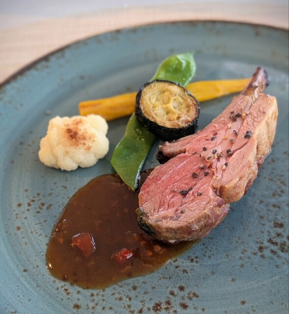 フーチバー香る 仔羊のロースト シャスールソース。大好きな仔羊、嬉しい♡メインはチョイス可能で宮古牛もありました。