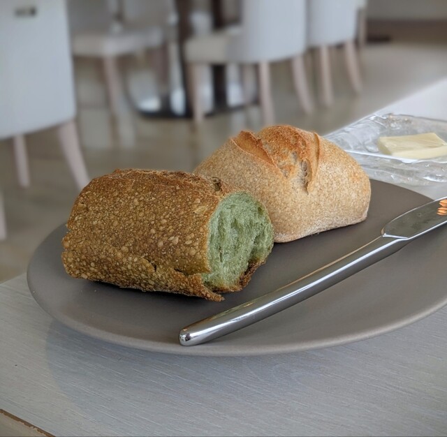 熱々のパン。緑はフーチバー(よもぎ)でした。