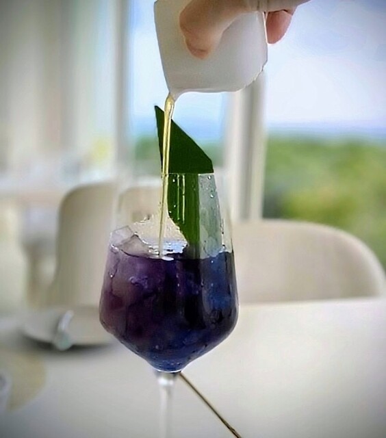 私はお勧めのモクテルを。 確か「宮古ブルースカッシュ」的な名前だと思いますが、お席で仕上げて下さり、本当に美味しい♡バタフライピーと、シークワーサータップリでシュワシュワ大好き♪