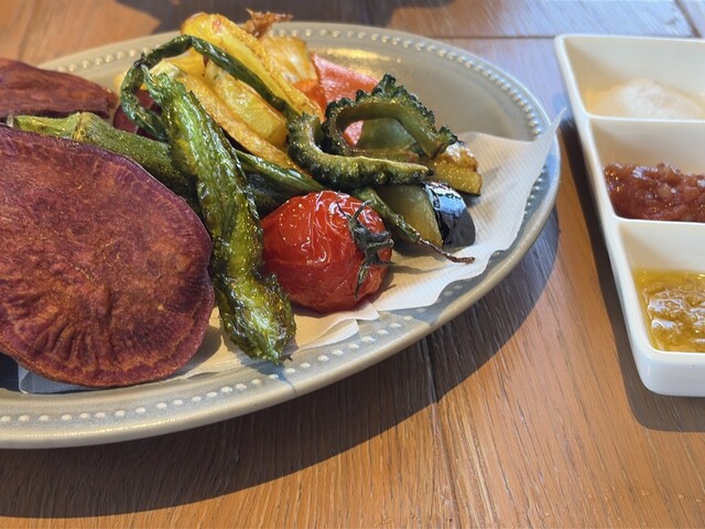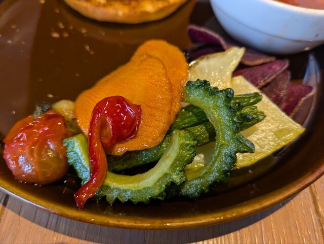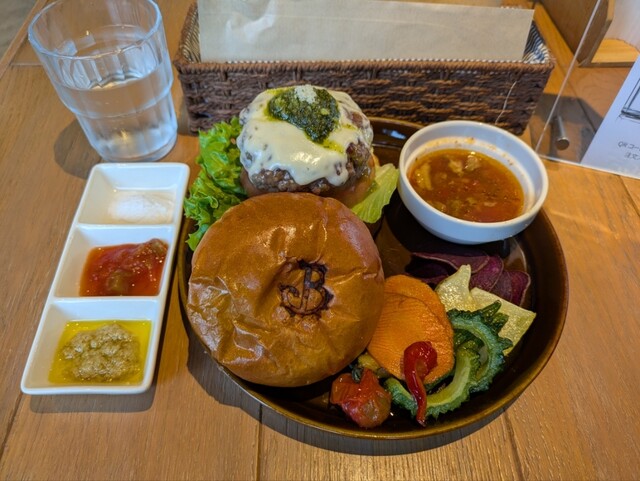 宮古野菜の素揚げと一緒に、地元でしか食べられない最高のハンバーガーを召し上がれ♪