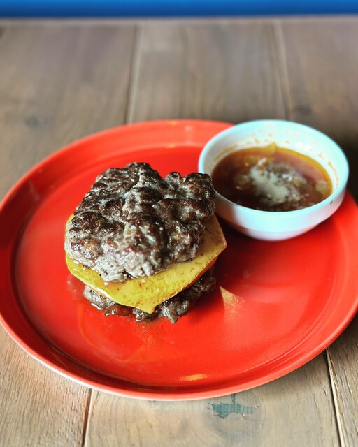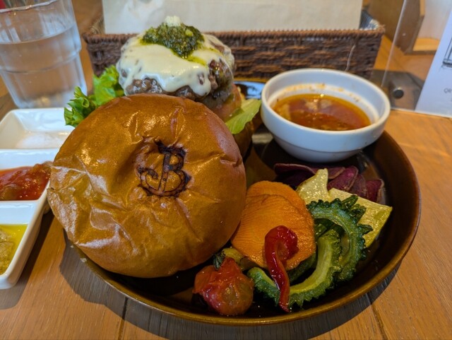 宮古牛の肉塊から引くパティは赤身の旨味と地元で取れたバジルソースをかけて♪一度食べるとやみつきに⭐︎