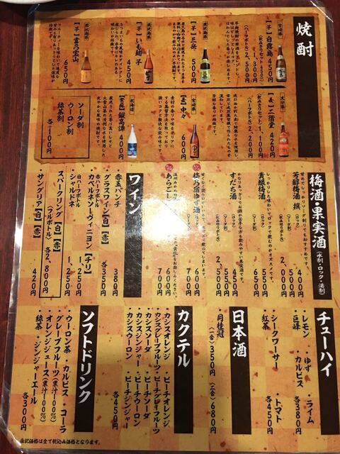 | ドリンク | ワインあり、カクテルあり、日本酒にこだわる、焼酎にこだわる |