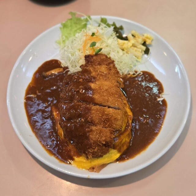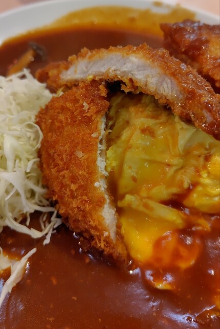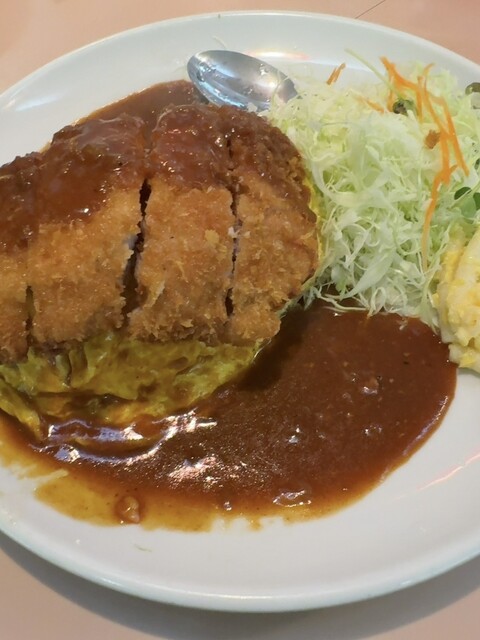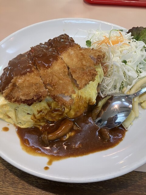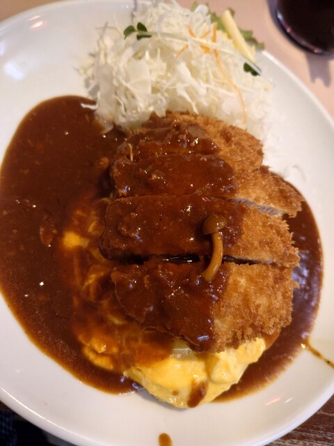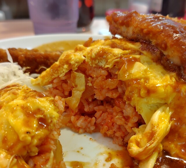 着席してから提供までは体感5分ほど。混雑時間帯でもこのスピード感はありがたい。目の前に運ばれてきたボルガ定食は、オムライスの上にトンカツがどんと乗り、さらに...