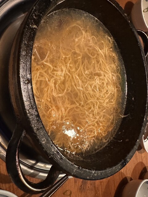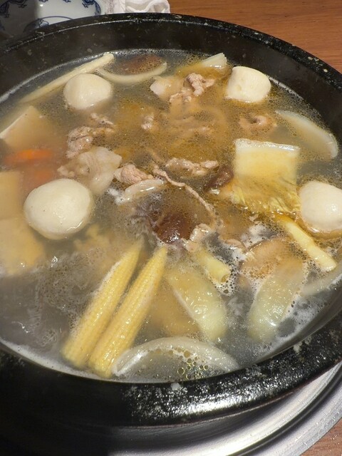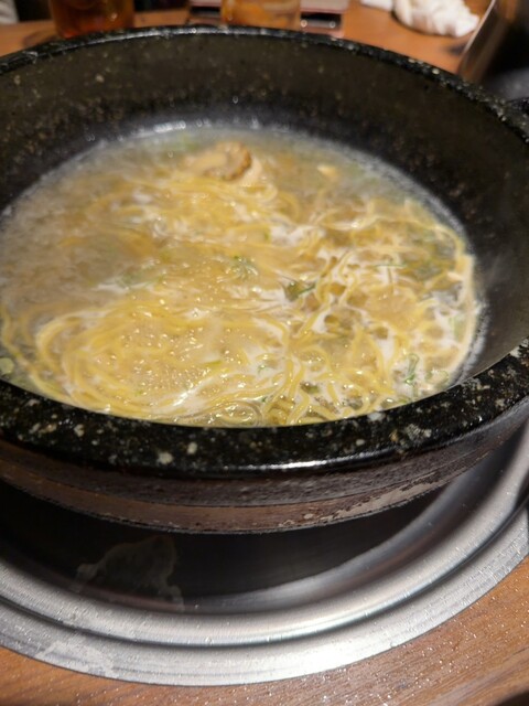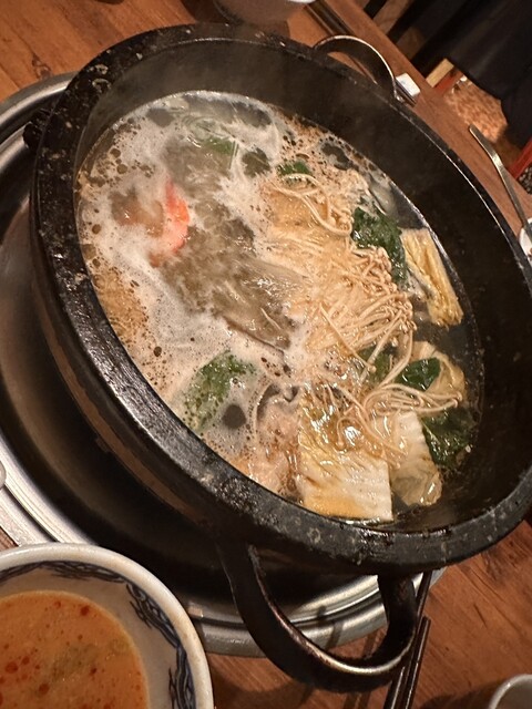 お店の入っているビルの下に到着して店の階を確認するとお店は5階。 エレベーターは4階まで。どうやって? はい4階から階段で上がります。この段階でかなりの隠れ家感です。 お店に入ると布で仕切られてテーブルが4つ。こじんまりとしています。 お料理は石鍋のコースのみの様です。 瓶ビール注文して宴... 詳細を見る