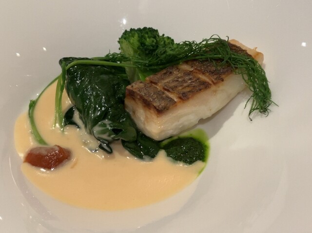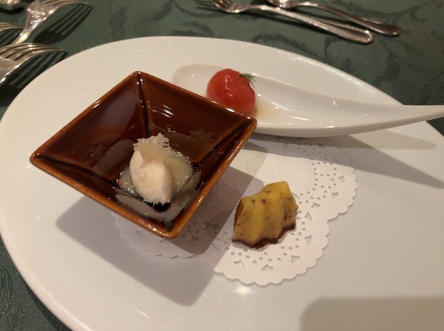 お一人様予約でランチコース、魚料理+肉料理を合わせたセット。 最初の一品はアミューズでケークサレとアンチョビのような小品、ワインは好みを事前に伝えてあったので、グラスの白ワイン、BERGER BARON(お代わりの赤ワインもこれでした) 料理と合わせるにはお手頃かなと思います。グラスで1000円ですし。 お料理の説明は丁寧に一通りしてくれまして(全部は覚えてなくてすみません) どの... 詳細を見る