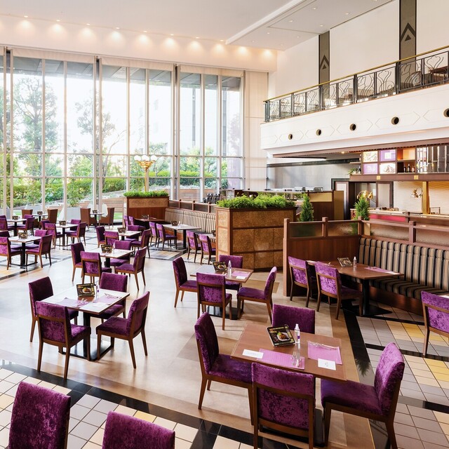 天井高11mの吹き抜けが開放感にあふれる店内では、座席間隔をあけて、ゆとりをもったスペースへご案内。「新しい生活様式」に対してできることを追求した、ビュッフェの“ニューノーマル”をお届けします。和・洋・中・デザートを自在に組み合わせて、ランチは120分間・ディナーは時間無制限でお寛ぎください。