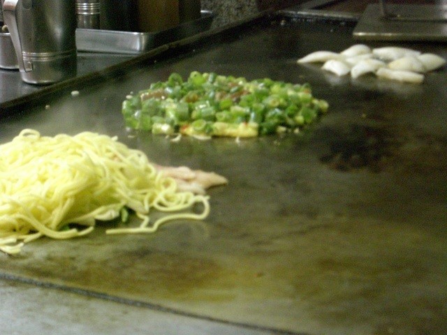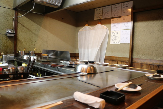 大きな鉄板を挟む伝統的コの字スタイルのお店です。