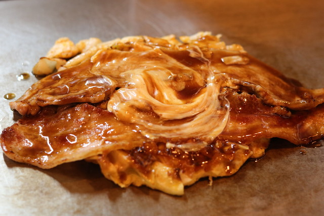 はみ出るほど大きな豚肉がドドーンと!豚玉は必食です♪