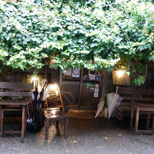 緑色の蔦で覆われたジブリの森のようなカフェ。