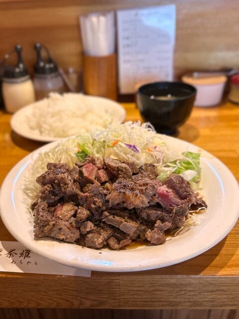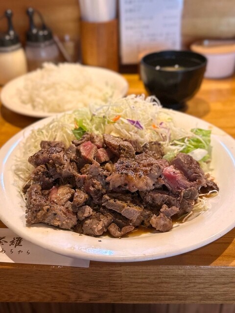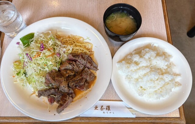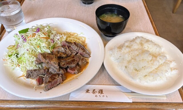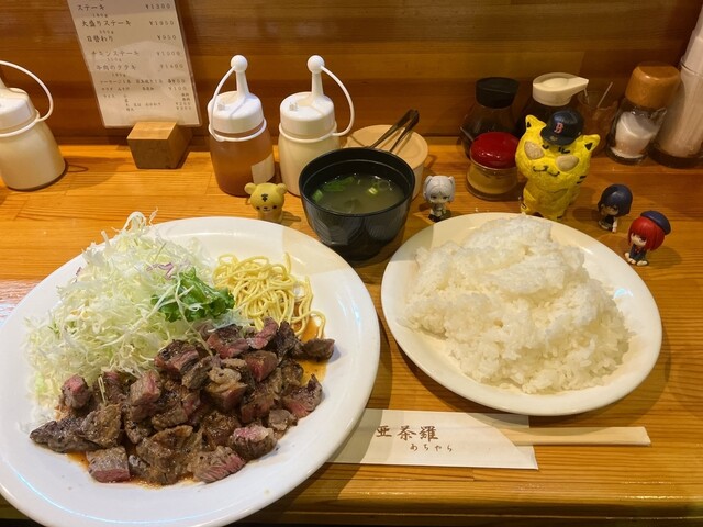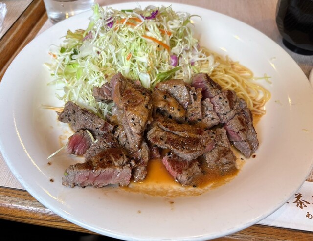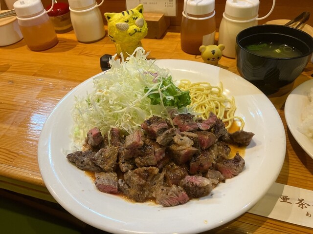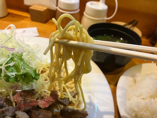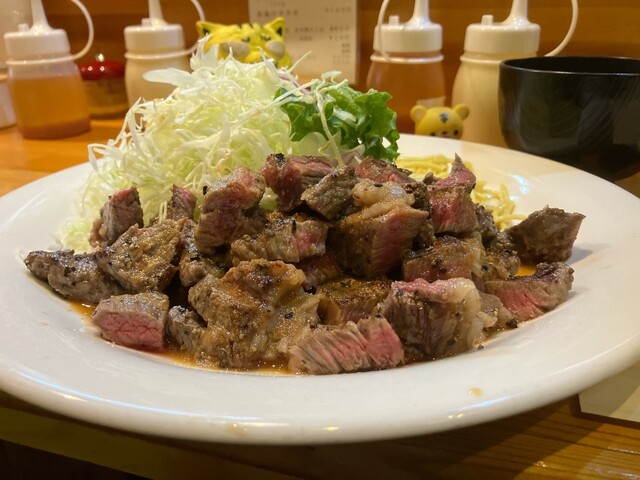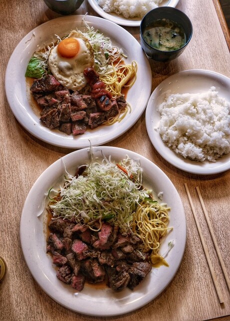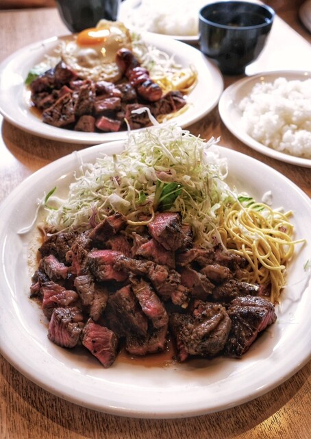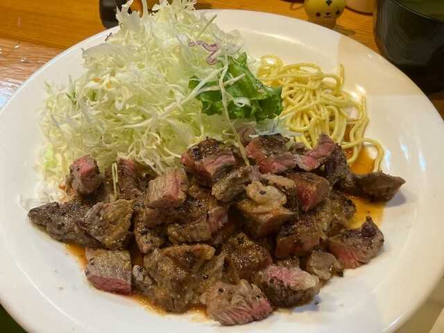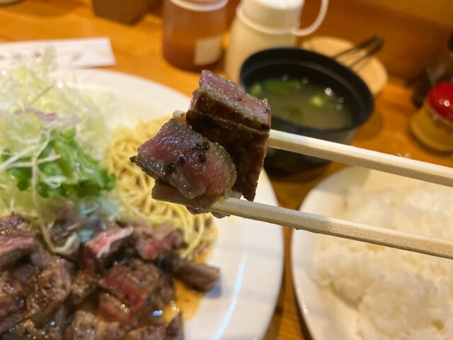 11:00を少しまわって、来訪。 急な階段を登って、店に入ると、既に、満席で、 運良くカウンターの一席だけが入れ替わりで空いたので、着席できました。 180g ¥1100のステーキランチをオーダー。 店は、横に、長く、入口から入ってすぐに、カウンター。 奥に、テーブル席があるようでした... 詳細を見る