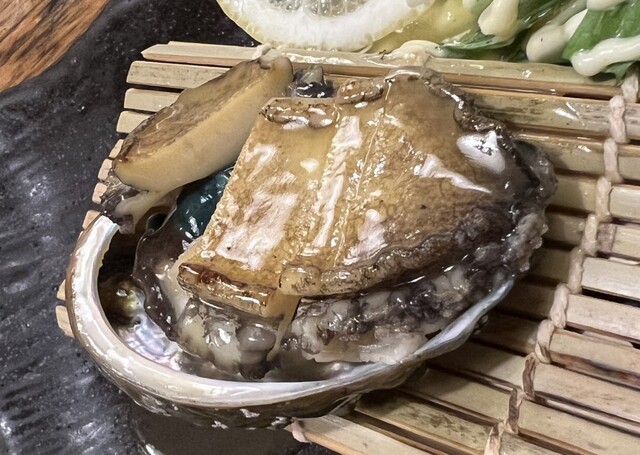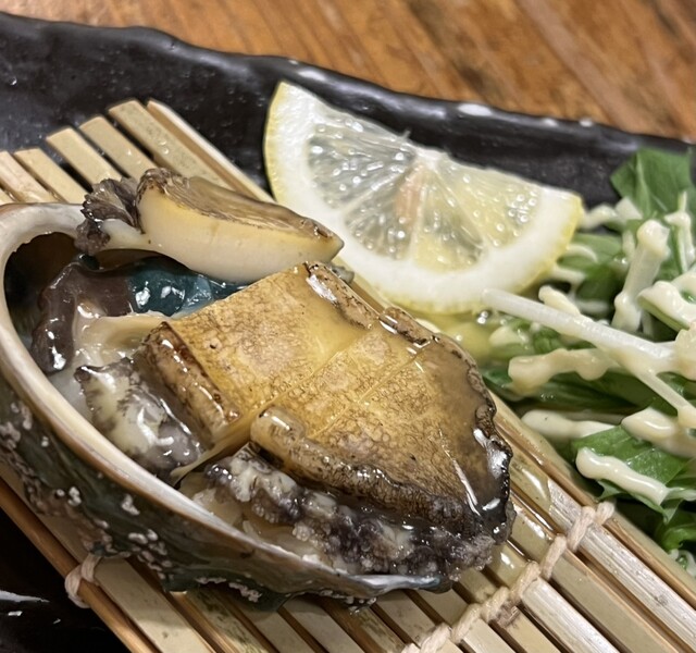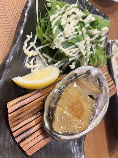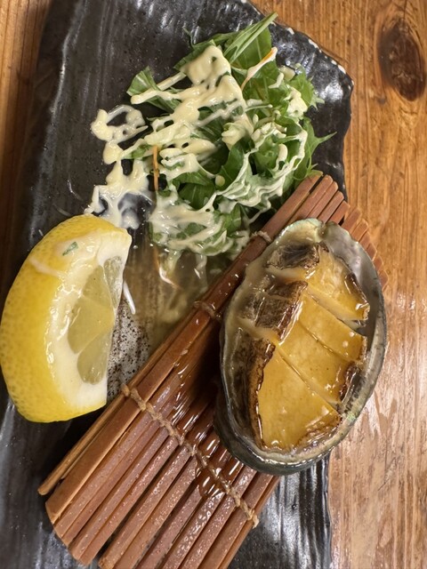 レモンサワーとアワビのバター焼き、骨煎餅...