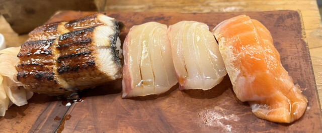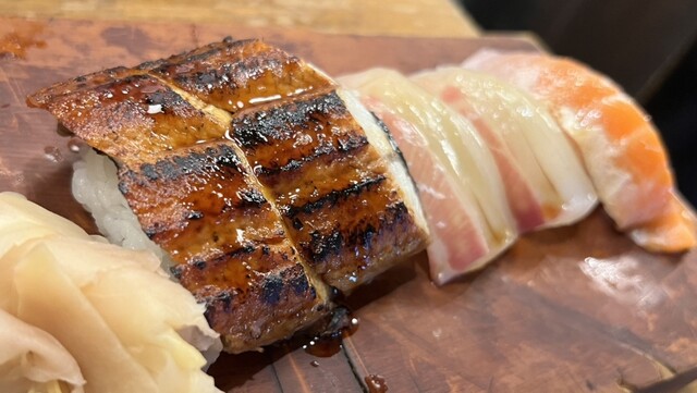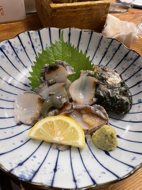 おでん五種盛りはすじ肉も大きめで満足。鯛ととろサーモンの握りはネタが良くて美味しく、うなぎは炙ってあり柔らかくて旨い。アワビの刺身はピクピクと生きていた。骨せんべいは大きくて食べ応えありで安くて旨い。