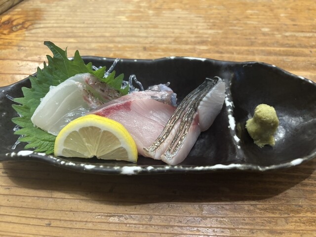 お一人様エリアを指定され着席、黒生中、刺身3種盛り、カサゴ姿揚げを頂きま...