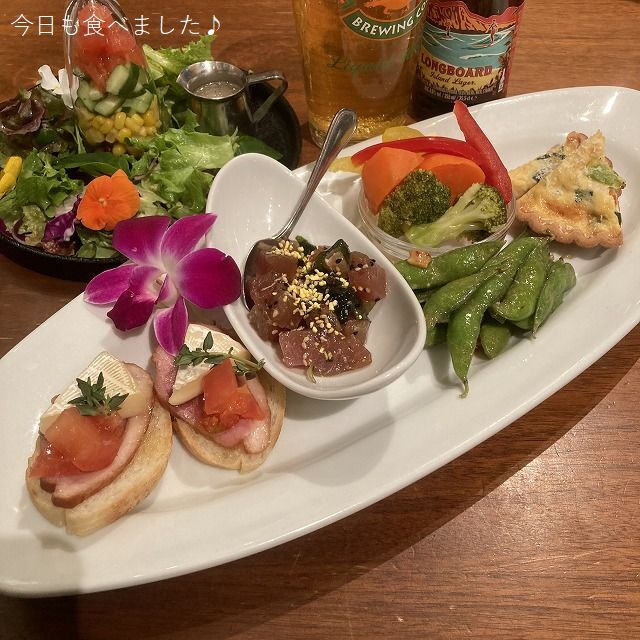 合鴨とカマンベール、マグロのアヒポキ、季節のピクルス、キッシュなどなど。