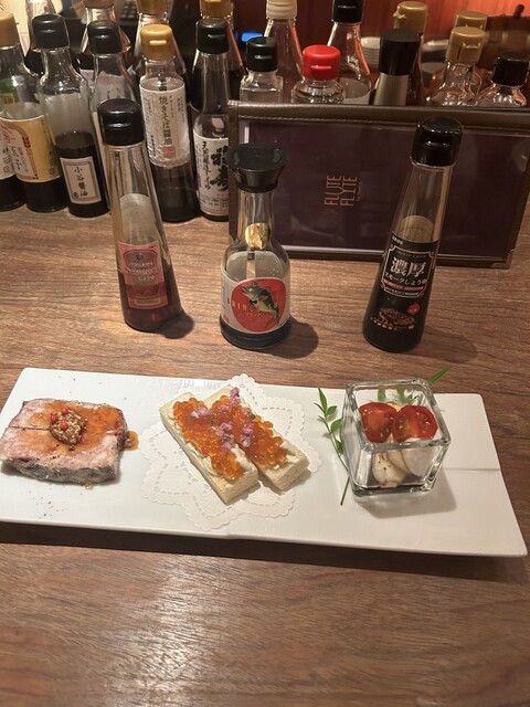 当店は北新地駅から約5分とアクセス便利なビルB1Fに店を構える隠れ家バーです。イタリアンとフレンチの経験があるシェフが手掛けるのは、醤油とのペアリングを楽しむこだわりの創作料理の数々。さらに希少なシャンパンとのマリアージュもご堪能いただけます。ジャズが流れる落ち着いた雰囲気の空間はデートや接待にも最適。2~3軒目はもちろん、醤油が楽しめるお料理に特化しているので、1軒目からもぜひご利用ください。 |