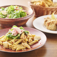 ★飲み放題付き!!削りたてチーズのシーザーサラダから始まり、名物鶏の唐揚げや旬の食材を使用した本日のショートパスタ、メインには名物グリルソーセージを盛り込んだお食事も楽しめるお昼だけの特別コースで昼飲み人気のプランです!