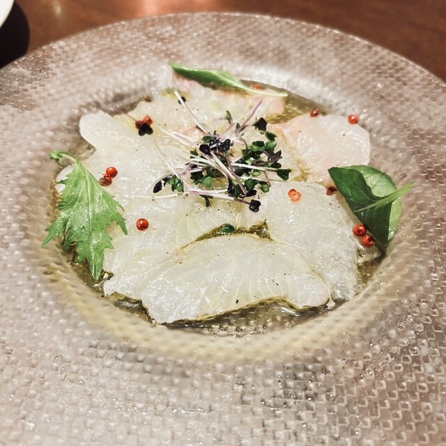 まずは前菜5種盛りと鮮魚のカルパッチョをつまみに白ワインで乾...