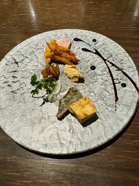 ・生ハムと柿・若鶏のガランティーヌ・ヤリイカの墨煮・三元豚とくるみのリエット・パプリカのマリネ・カボナータ・鰻のキッシュ