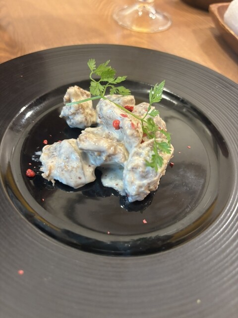 で、いただきました。 基本、全品美味しかったです。 はじめにサラダが出てきたのが嬉しかったですね。食べるスタンバイ完了ってとこで、、、 突き出しの3種盛りからまず良かったですね。特に真ん中のずりは過去一と思いました。程よいコリコリ感じやけど固さは無くてかかってるソースが良かったのか大変美味しくて、そこから次々と出てくるコースの鴨の串はとても良かったです。 鴨肉としては柔らかめに感じまし... 詳細を見る