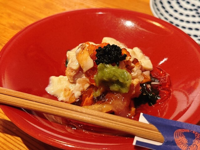 料理はどれもひと工夫が効いていて楽しいものばかり。お通しからして手が込んでおり、コース料理のようなスタートにわくわく。「おまかせ5串(980円)」はぷりぷりジューシーな焼き鳥の食べ...