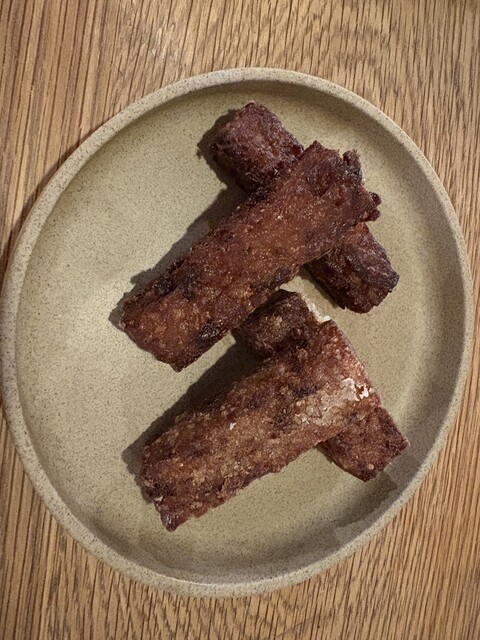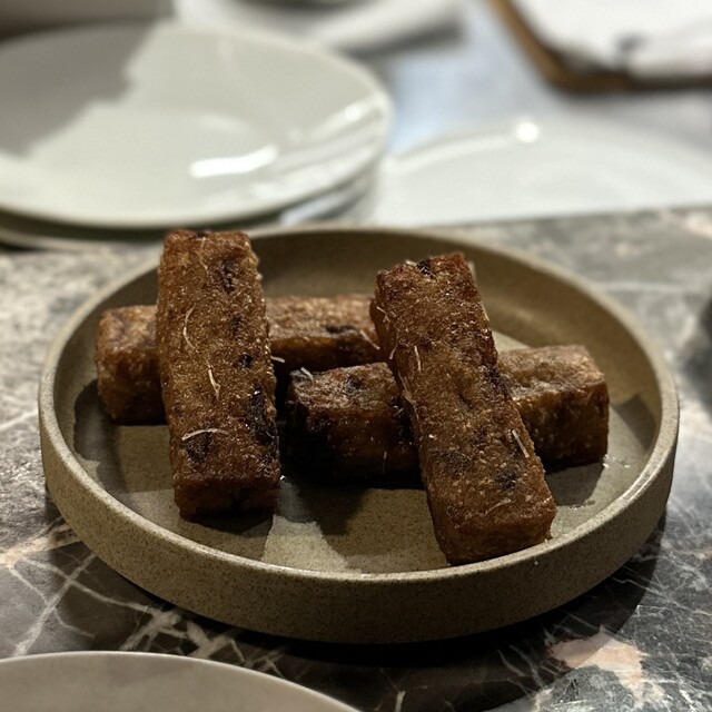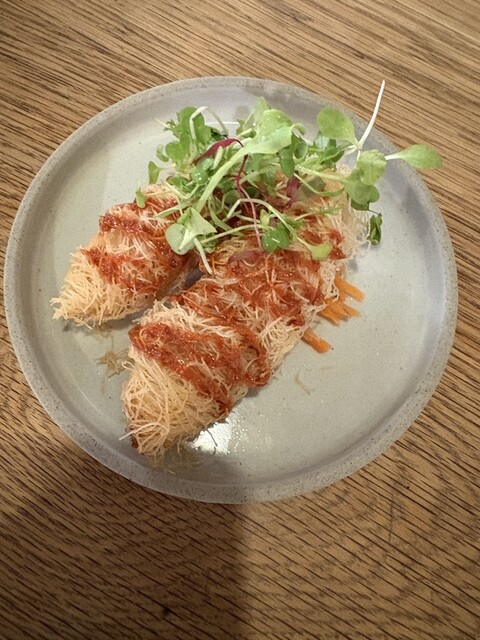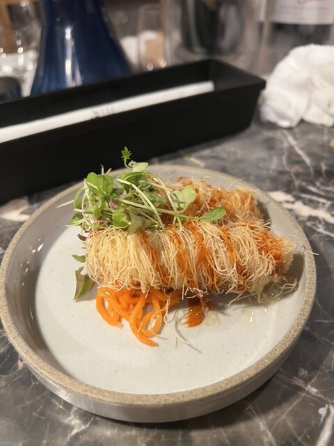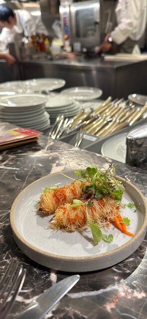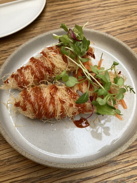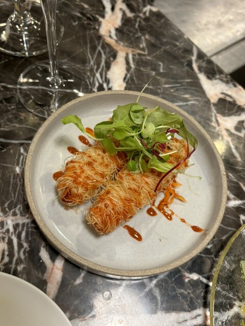 天使エビのカダイフ包みは、サクサクっとしたおしゃれな衣?とぷりぷりの大きなエビがマッチして最高に美味しく、贅沢な一品でした…!!